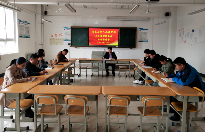 3月27年,信息与电气工程学院在B6-209召开“工匠精神进校园”活动推进会,会议由党支部副书记杜元贞主持,全体学生工作人员参加。