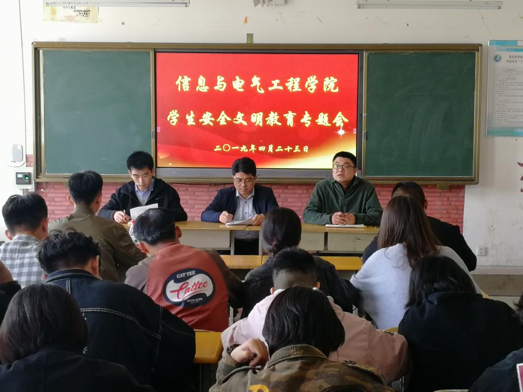 4月23日,信息与电气工程学院在B4-207召开信电学院学生安全文明教育专题会。党支部副书记杜元贞、团总支书记周大勇和辅导员夏斌老师出席。17、18级主要学生干部参加。