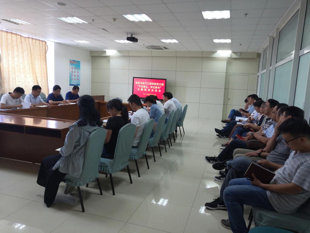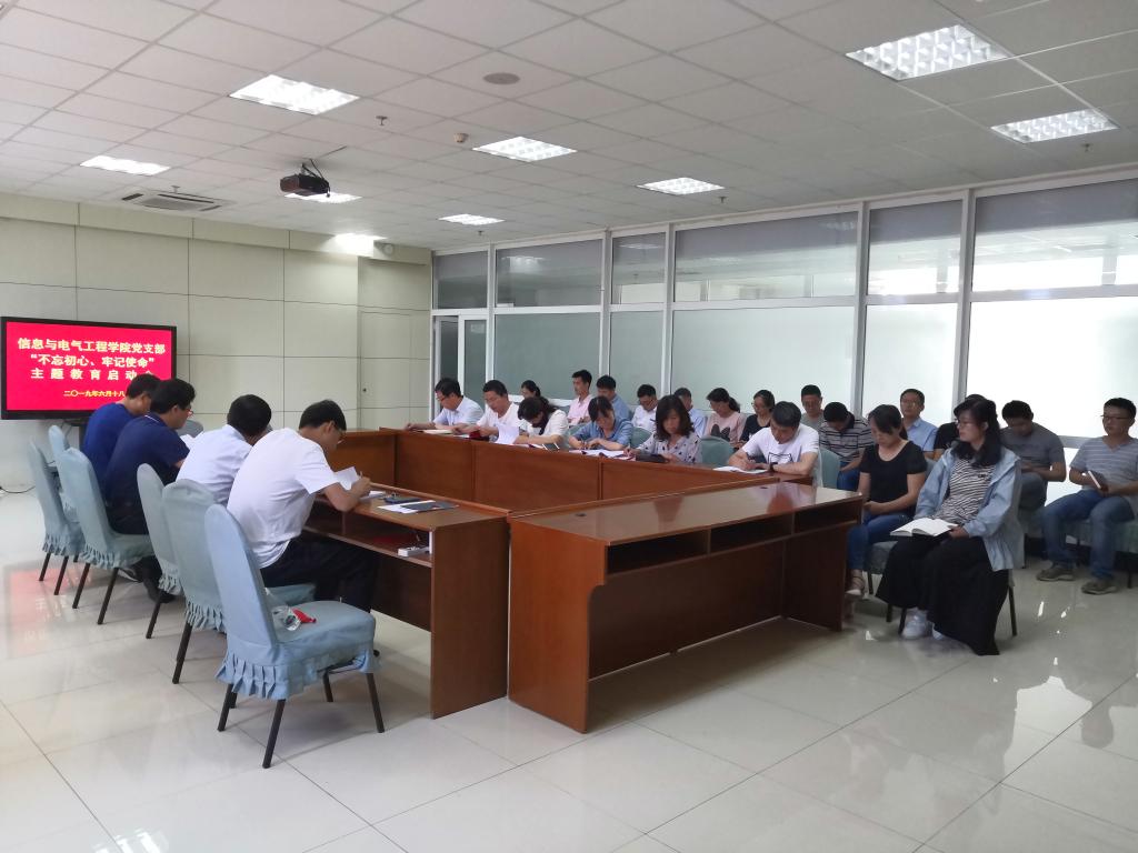 6月18日,信电学院党支部在A0-B820召开“不忘初心、牢记使命”主题教育启动会,学院党支部副书记杜元贞主持,全体党员参加会议。