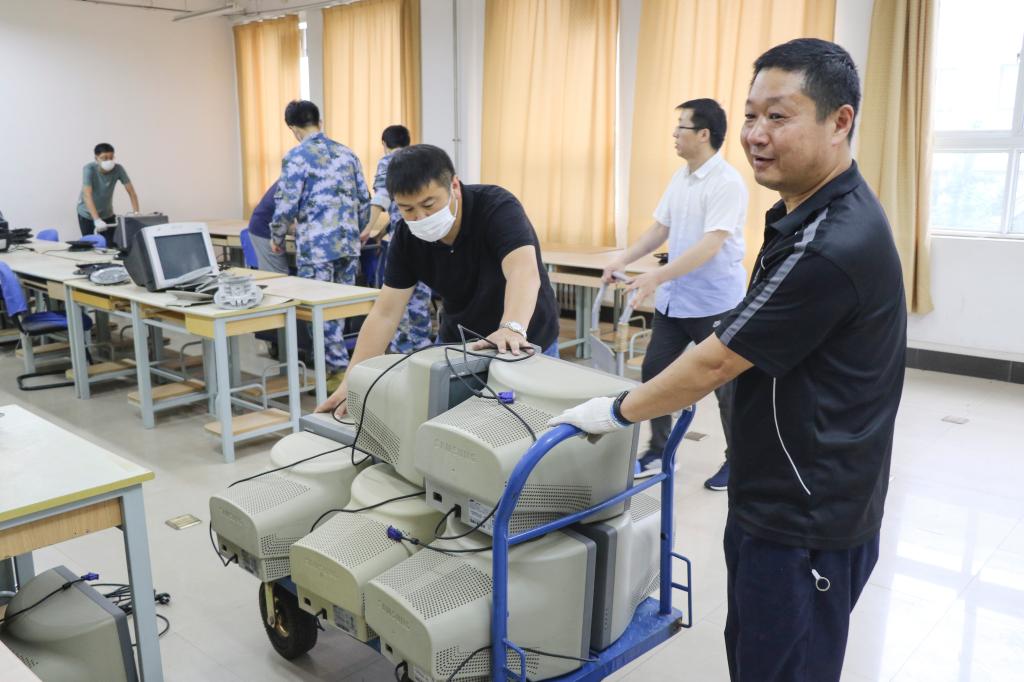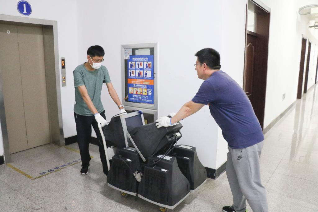 活动中,全体党员发扬不怕脏、不怕苦、不怕累的精神,拆电脑、搬运显示器,抬桌椅,清理卫生,现场一片热火朝天的景象。经过一上午的劳动,一个实验室的所有的电脑、桌椅全部转运到指定地点。