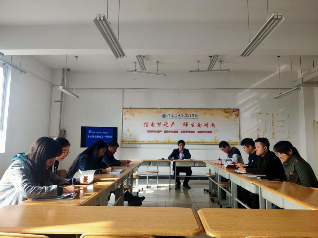 10月30日,信息与电气工程学院在B6-316召开学生思政教育工作研讨会,会议由学院党支部副书记杜元贞主持,全体辅导员参加。
