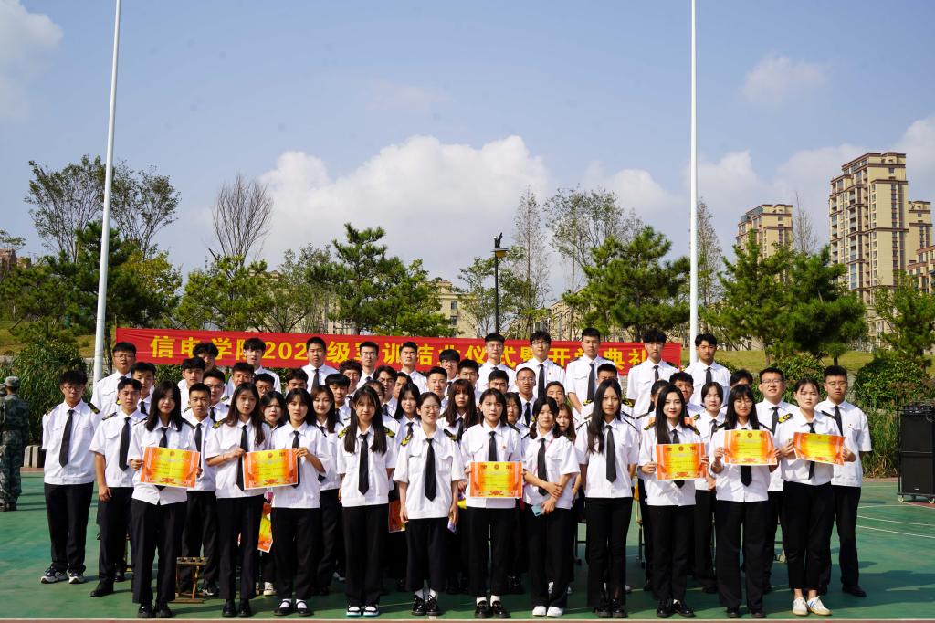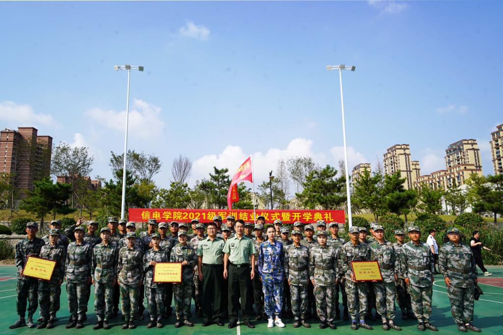 结训仪式上,四个受阅方队依次通过主席台,同学们步伐整齐,口号响亮,充分展现出信电学子良好的精神风貌。汇报表演结束后,全体师生起立,奏唱国歌。随后,盖延亮宣读了《信电学院2021级新生军训表彰决定》,并对先进集体和先进个人进行颁奖。新生代表、老生代表依次发言。接富超总结了为期两周的军训成果,勉励新生把军训的优良成果尽快转化为学习的动力,发扬勇敢、坚毅、顽强、拼搏的军训精神,努力发展成德智体美劳全面发展新时代大学生。