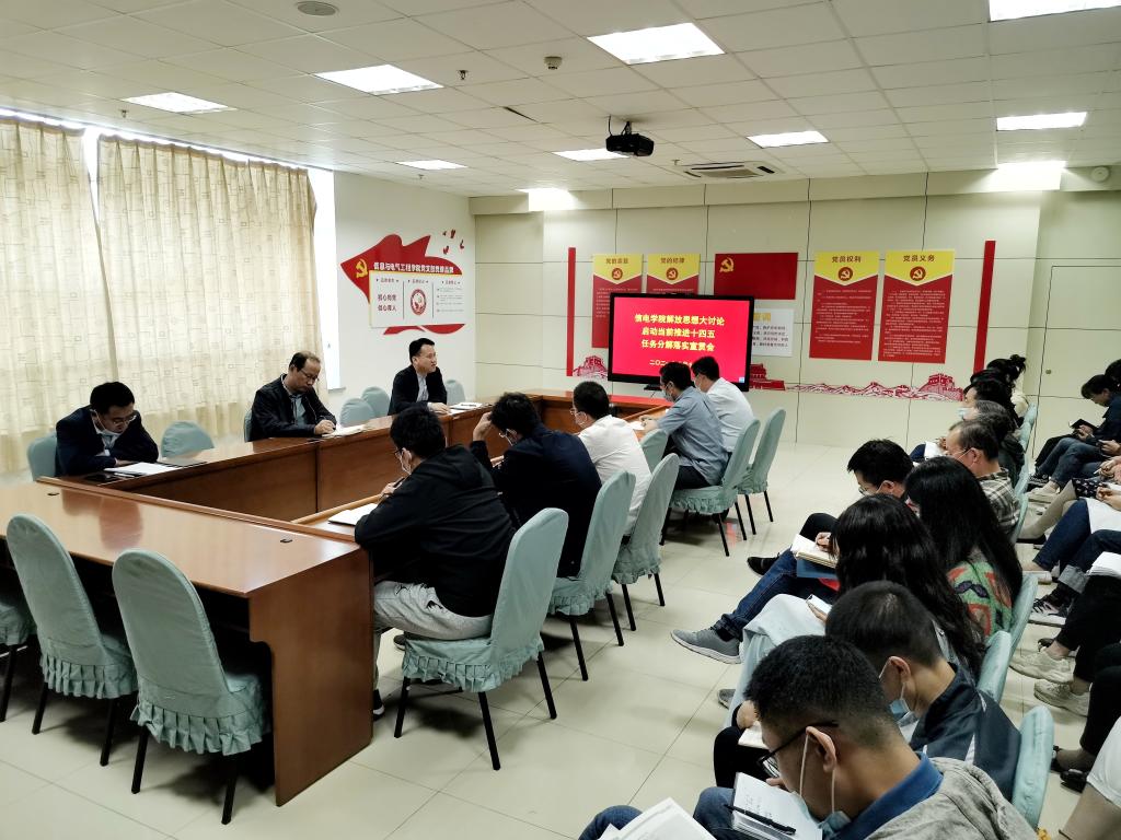 10月12日下午,信电学院在A0-B820会议室召开会议,宣贯学校解放思想大讨论启动当前推进十四五任务分解落实成果汇报会精神。学校招生就业处副主任房坤参加会议并作解放思想大讨论汇报分享。信电学院全体职工参加会议,会议由信电学院负责人王浩主持。