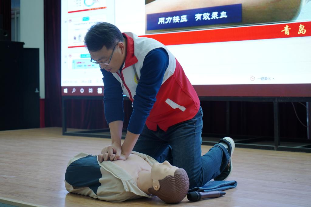 本次讲座主要分为理论讲解和实践操作两个部分,武心庆首先介绍了“第一响应人”对现场急救、挽救生命的重要性;讲解了现代心肺复苏以及烧烫伤、溺水、触电、酒精中毒等常见突发情况应对的基本理论知识,并对基本技能进行了实践操作。