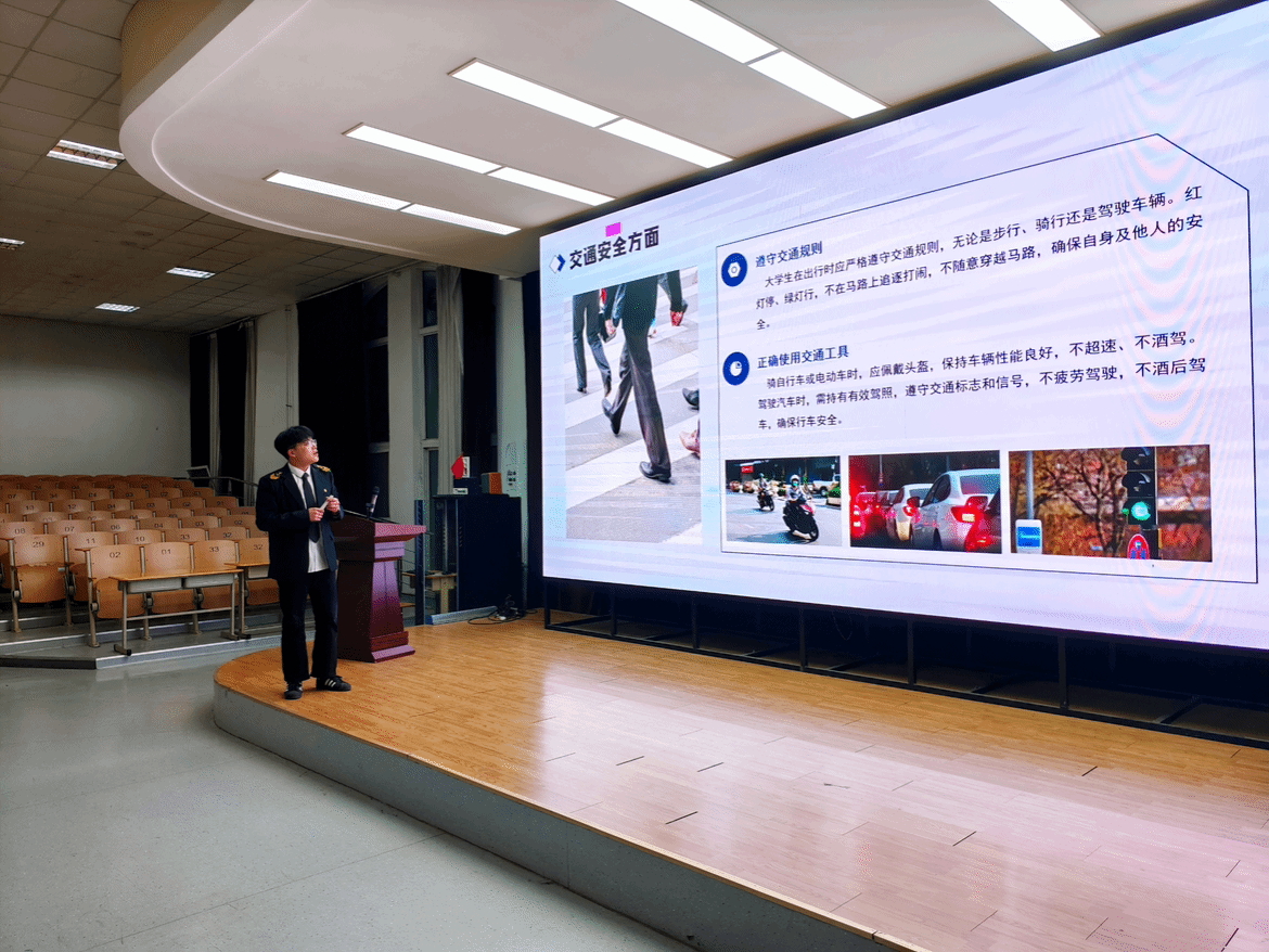 讲座创新采用多维度安全教育模式,围绕交通安全、宿舍卫生安全、网络安全、心理健康安全和应急能力五大核心领域展开,全面覆盖大学生日常生活中的潜在安全隐患。许一飞结合典型案例分析,并通过互动交流,帮助同学们更全面地认识安全问题,掌握危险情境下自我保护与救助他人的基本技能。