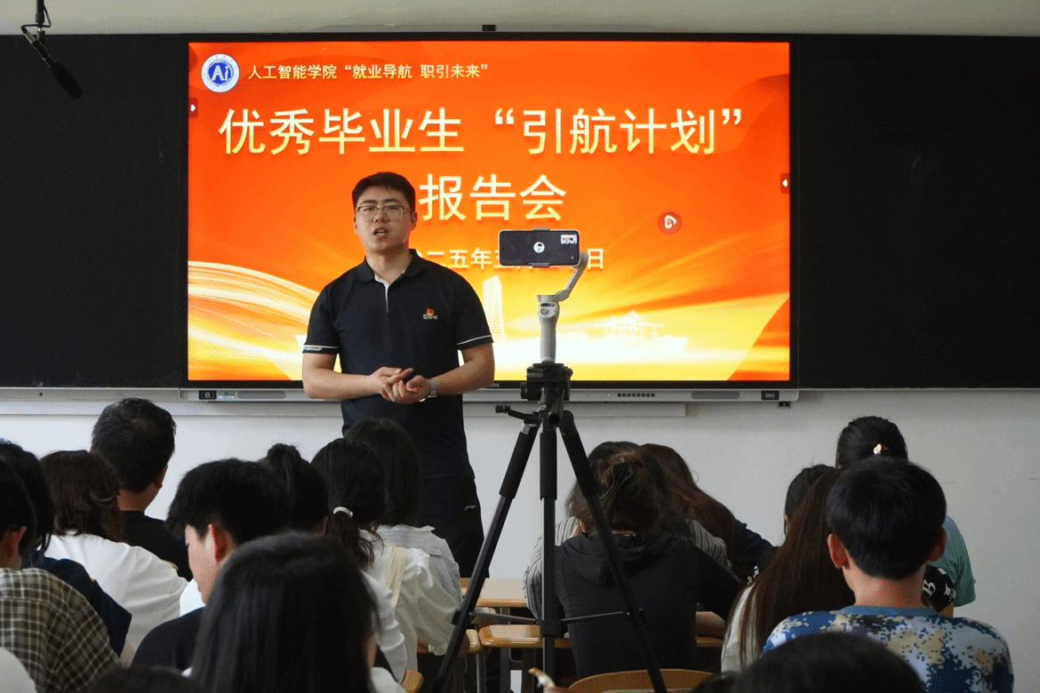 会上,宋树发结合自身经历,开展职业发展分享。他详细讲述求职经历、职场进阶心得与行业成长故事,深入解析职场文化,传授职场适应技巧,帮助同学们明确职业发展方向。宋树发着重介绍自动化码头运维等新兴岗位,并通过现场模拟环节,指导在场同学结合专业优势进行求职展示。