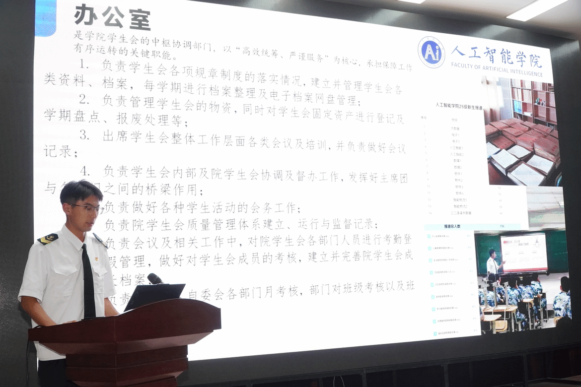 培训过程中,纪强首先介绍了学生会、自委会组织架构及各部门成员,强调学生干部应具备的责任意识、服务精神等综合素质。随后,苗宇晨结合具体案例与工作流程,系统讲解了各部门工作职责与规范,并在讲解中融入沟通协调、团队协作等综合素质培养内容,帮助新成员快速适应工作内容。