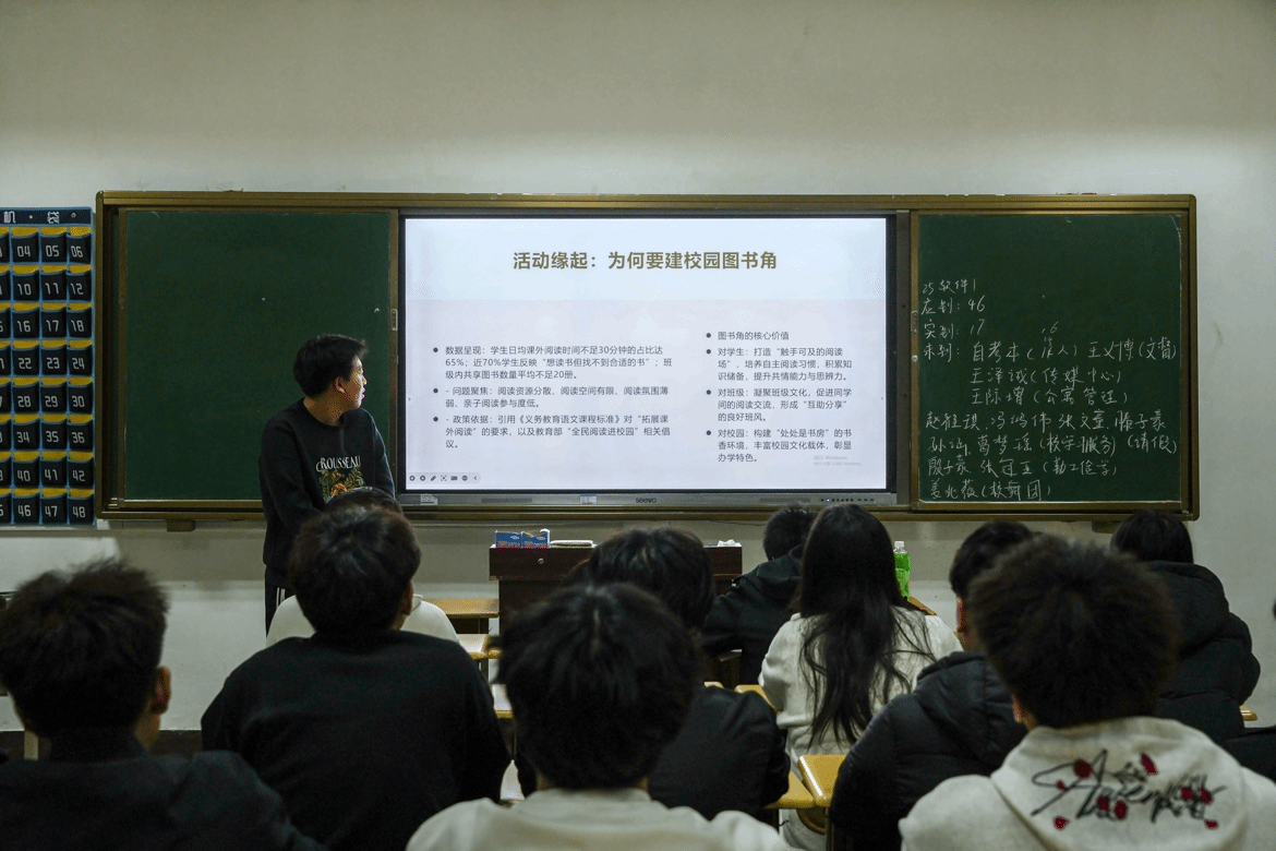 活动在各班晚自习教室展开,同学们轮番登台,通过ppt展示等形式分享心仪书籍。从文学经典到科技前沿,从人物传记到哲学思辨,真挚的阅读感悟引发了台下阵阵掌声。互动环节同学们提问踊跃,思想火花不断迸发。经过现场投票,各班评选出“最受欢迎分享者”。活动尾声,班委进行总结并组织合影。