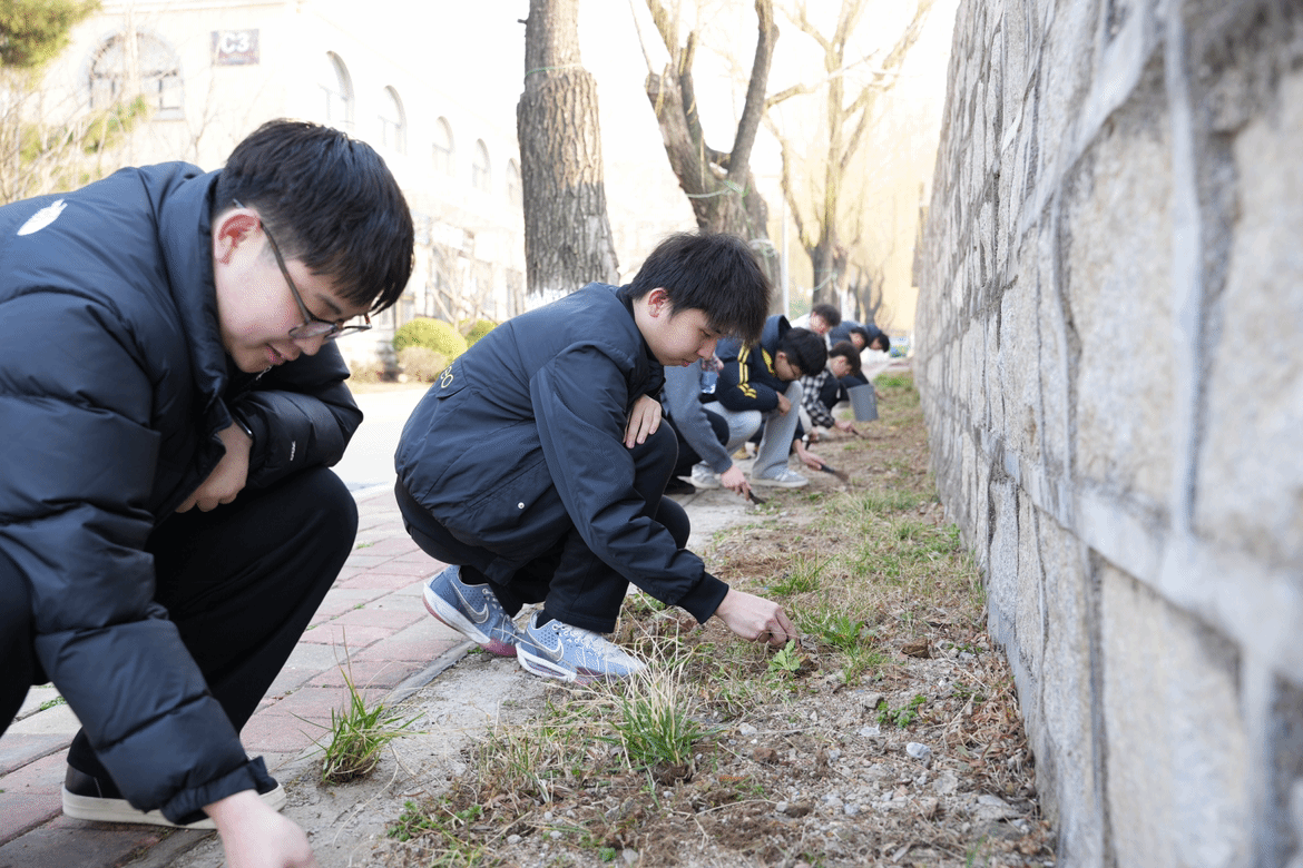活动期间,同学们分组协作,认真清理绿化带中的杂草,让土壤放松“呼吸”。大家仔细捡拾道路两旁的垃圾,还原整洁清新的校园环境,对松动、破损的护树桩进行加固和修复,为树木营造一个稳定生长的环境。