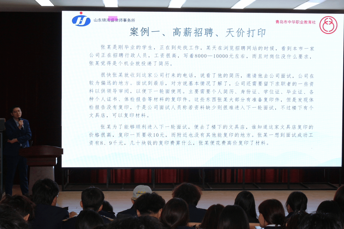 讲座中,周玉龙围绕与学生学习生活、职业发展密切相关的法律问题展开讲解,结合真实案例,用通俗易懂的语言为同学们进行解读,拆解求职中易遇的诈骗套路,提醒学生需警惕陷阱,提前学习法律知识,学会用法治思维规范自身行为、维护合法权益。