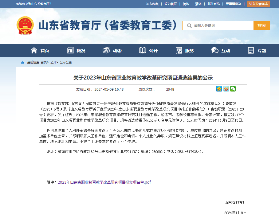 近日,山东省教育厅公布了2023年度山东省职业教育教学改革研究项目评审认定结果,我院5项课题获2023年山东省职业教育教学改革研究项目立项。