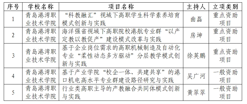 在2023年职业教育教学改革研究项目申报过程中,学院根据《山东省教育厅关于做好2023年度山东省职业教育教学改革研究项目申报工作的通知》(鲁教职函〔2023〕23号)精神要求,积极组织申报,并邀校内外专家进行了评审和推荐。最终学院向省厅推荐申报6个项目,其中5项获得立项:曲磊主持的《“科教融汇”视域下高职学生科学素养培育模式创新与实践》、房坤主持的《海洋强省视域下高职院校港航专业群“以产定教以教促产”建设模式改革与实践》、徐英鹏主持的《基于企业岗位需求的高职机械制造及自动化专业“柔性动态多方驱动”分层教学模式创新与实践》、吴广河主持的《基于产业学院“校企一体、共建共享”的港口机电高水平专业群建设路径研究与实践》、黄翠翠主持的《行业类高职主导的产教融合共同体模式创新与实践》5个进入立项公示名单,其中重点资助项目3项,一般项目2项,省支持资金总额22万元,立项率达83.3%,立项质量和立项数量位于青岛市第一位,重点项目立项数位于全省高职院校第二位。