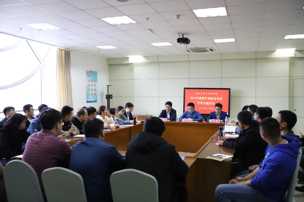11月2日,信息与电气工程学院在学校图文信息楼B820召开2019年高职扩招机电专业主题班会,2019年高职扩招机电专业的同学们参加了班会,学院院长苏本知、副书记杜元贞、副院长盖延亮出席班会。