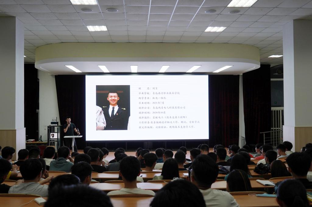 青岛鸿普电气科技有限公司的徐总首先介绍了公司的基本情况、发展前景,人力资源部汤主管从职业发展规划出发,结合目前公司的几个重要项目,详细讲解了公司相关岗位要求和职业升迁路线。随后,2021届顶岗实习优秀学生刘玺、李颖、李沁璐分享了在公司近一年来的工作与成长经历。